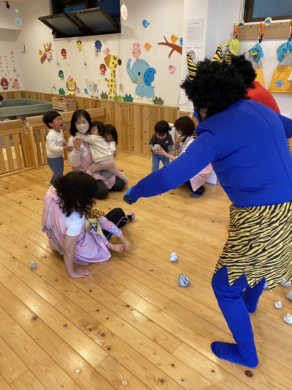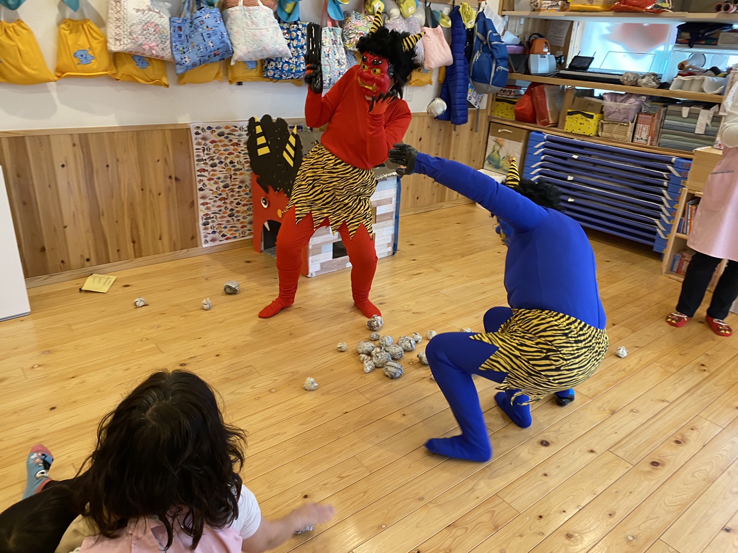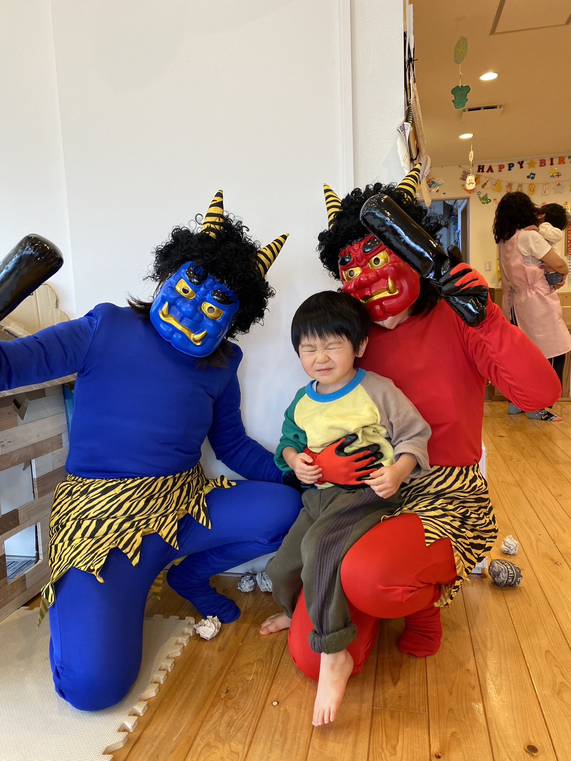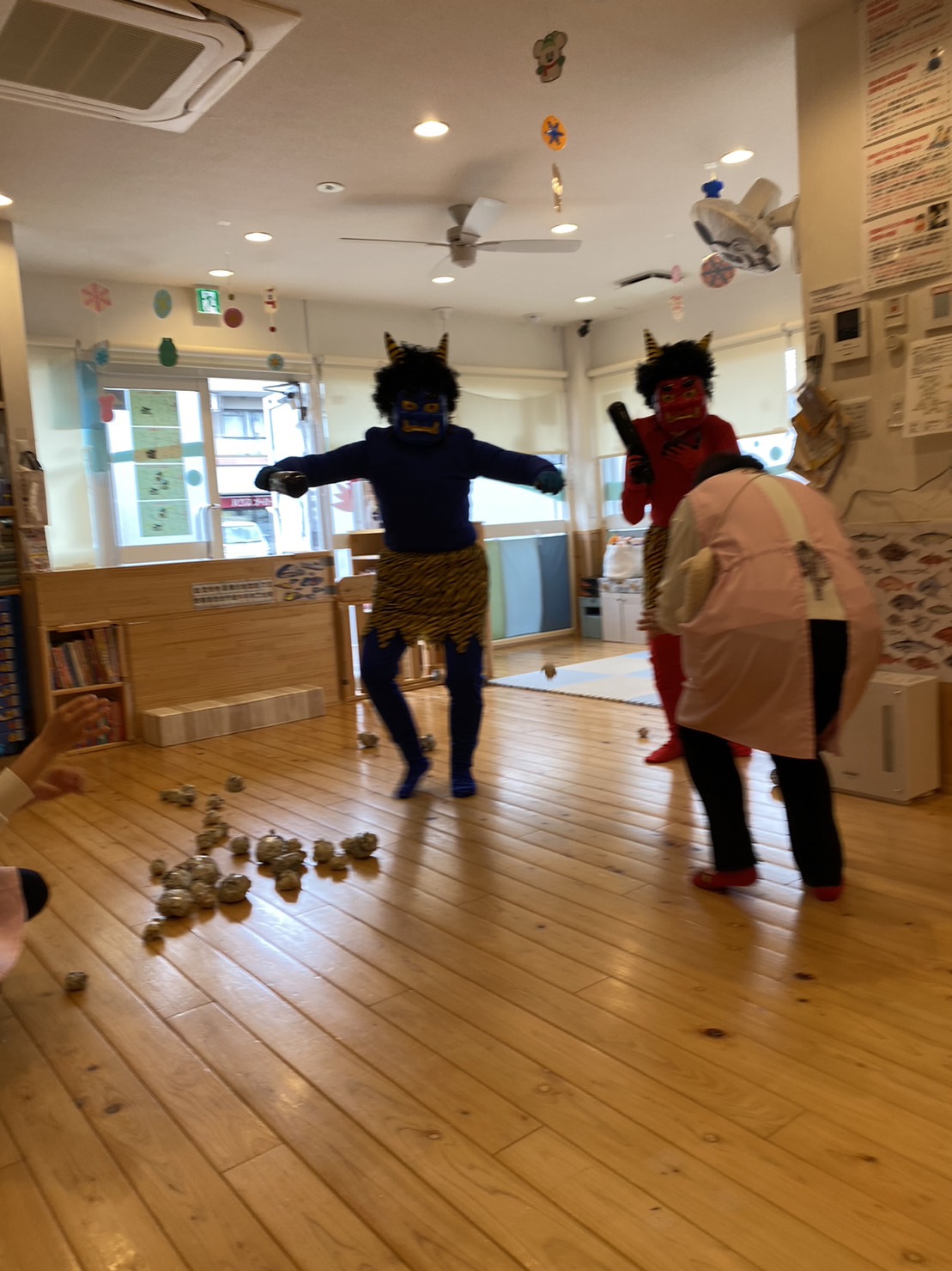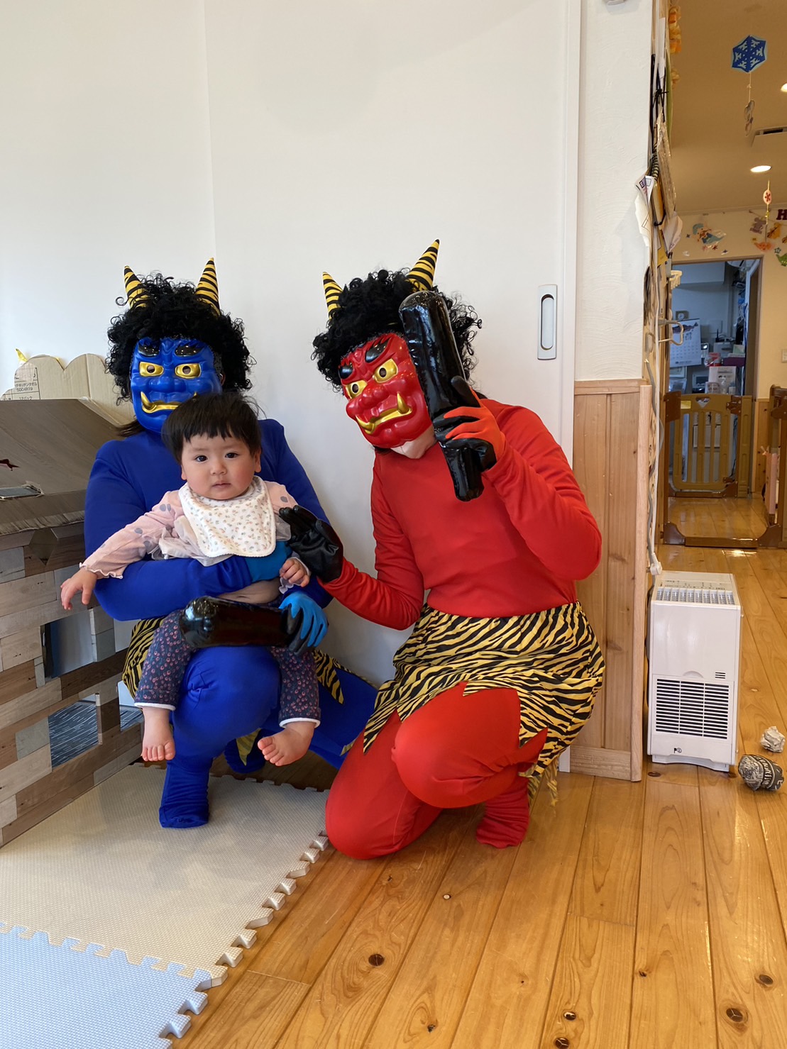 節分の豆まき 節分の豆まきが行われました。 恒例の青鬼・赤鬼が今年もいとほし保育園にやって来ました👹 予めアンケートを取り、鬼と闘って新聞紙ボールを投げるチームと、サークルに入って待避するチームに分かれました。 5・4とバランスよく分かれましたが、いざチャイムが鳴ると大泣きする子。 素早く逃げる子。あれだけ練習した豆まきでしたが、今年は積極的に投げる子はいませんでした💦 その代わり和むのも早く、最後は記念撮影にハイタッチでお別れしました👋