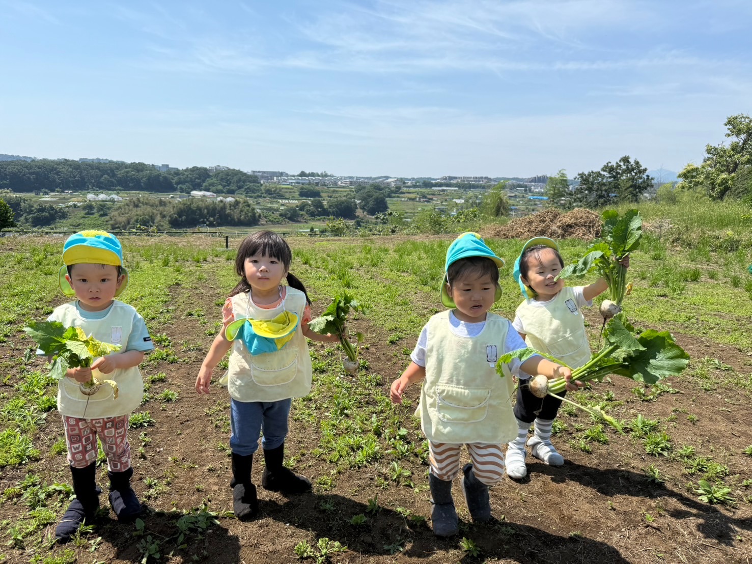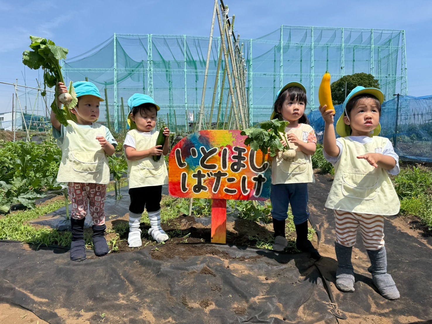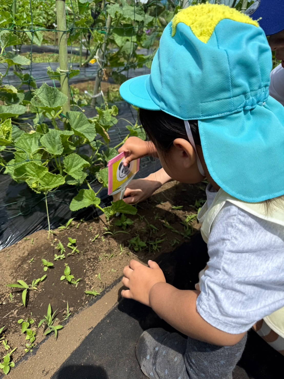星組さんと畑へ行って来ました 星組さんと畑へ行って来ました! カブとズッキーニなど収穫しました。 大きなかぶの絵本のように、収穫しているおともだちは両手でしっかりつかみ一生懸命引っ張り、 待っているおともだちは『うんとこしょ!どっこいしょ!』の掛け声で応援しました。 自分のジョウロでお気に入りのお野菜にお水をあげ、自分のマークをつけてきました! 黄色いズッキーニを見つけると『ばなな!』と盛り上がっていました!