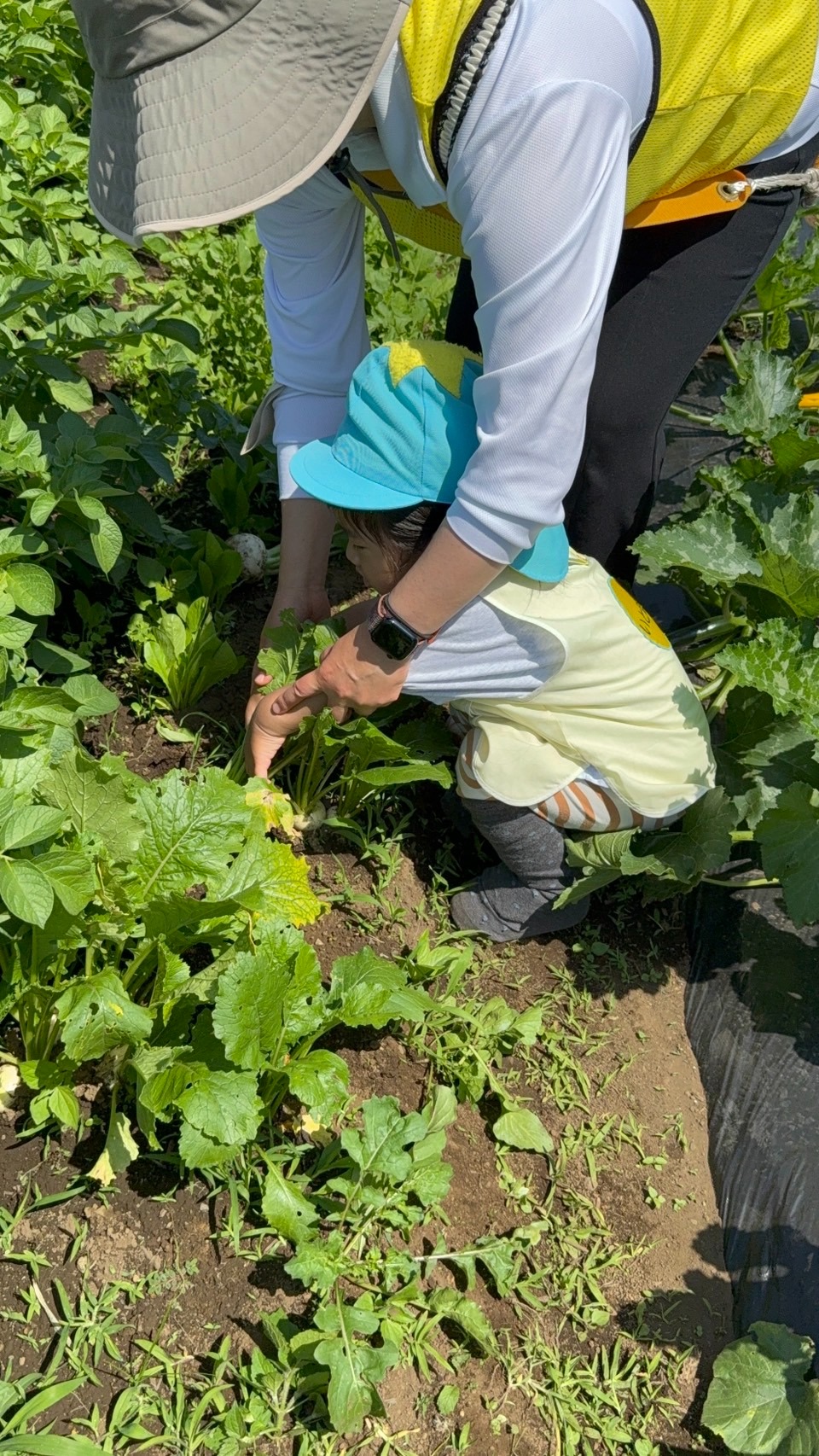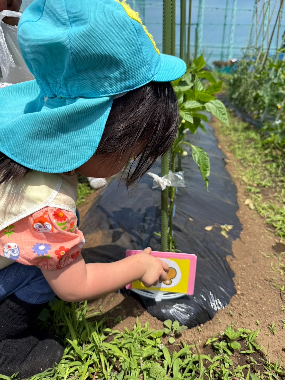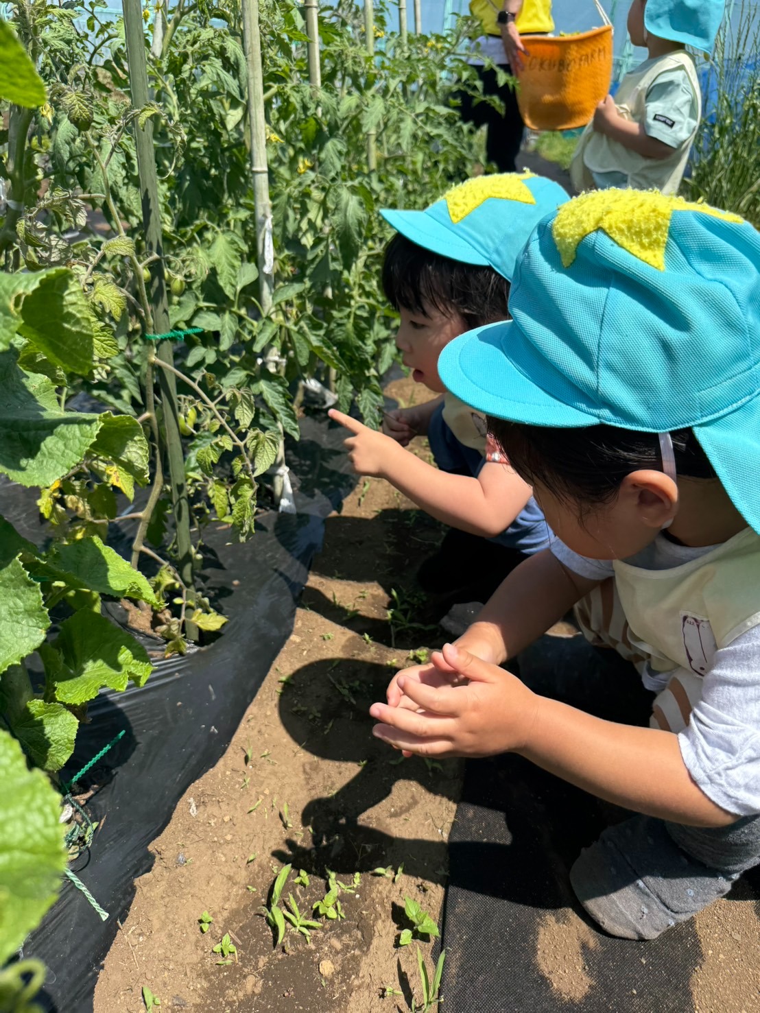 星組さんと畑へ行って来ました 星組さんと畑へ行って来ました! カブとズッキーニなど収穫しました。 大きなかぶの絵本のように、収穫しているおともだちは両手でしっかりつかみ一生懸命引っ張り、 待っているおともだちは『うんとこしょ!どっこいしょ!』の掛け声で応援しました。 自分のジョウロでお気に入りのお野菜にお水をあげ、自分のマークをつけてきました! 黄色いズッキーニを見つけると『ばなな!』と盛り上がっていました!