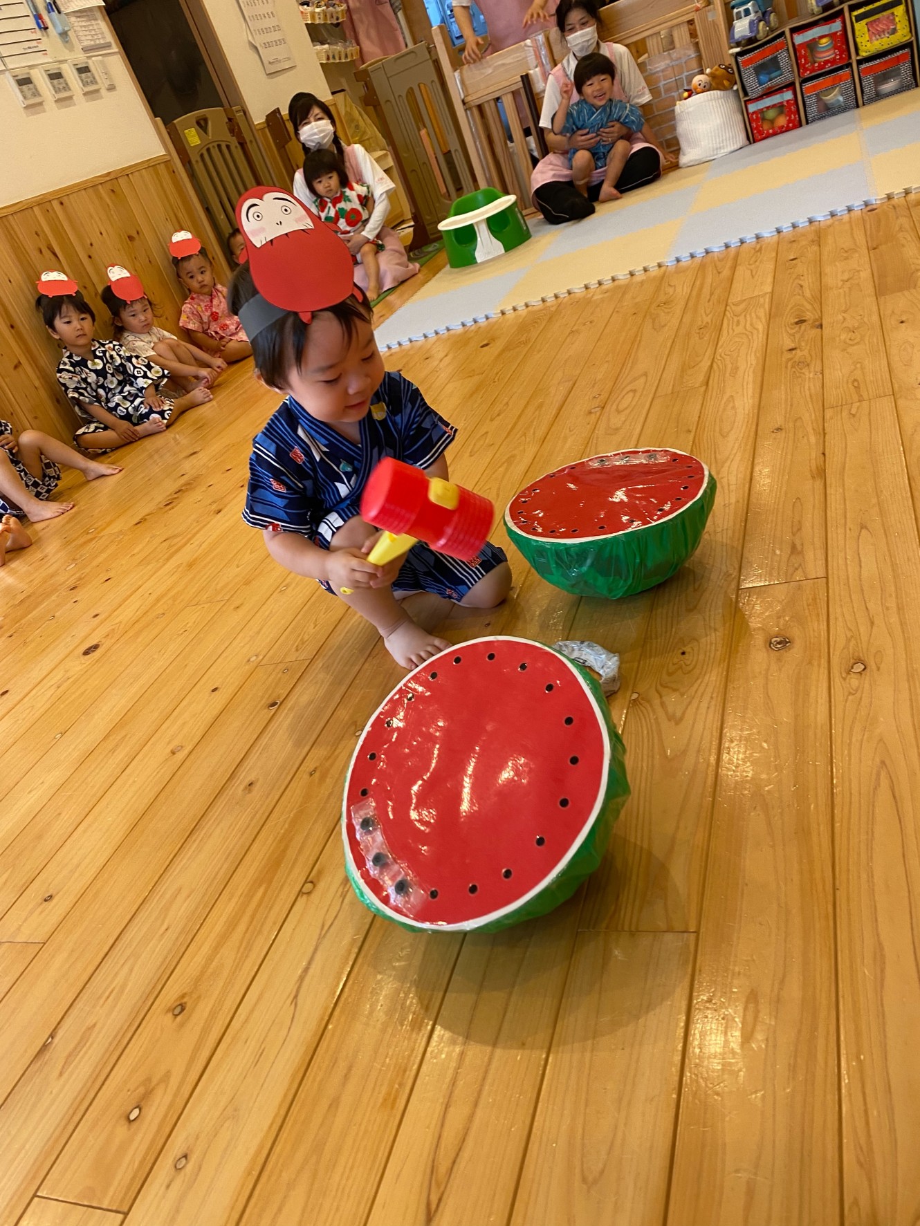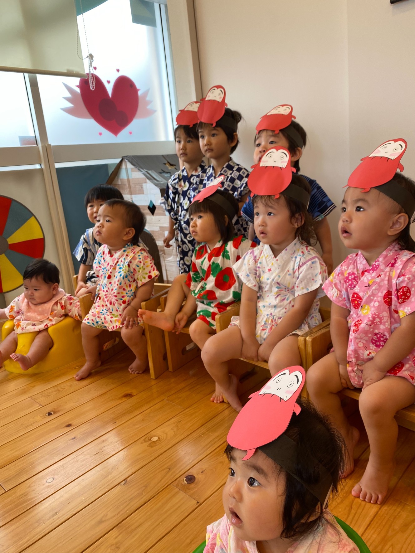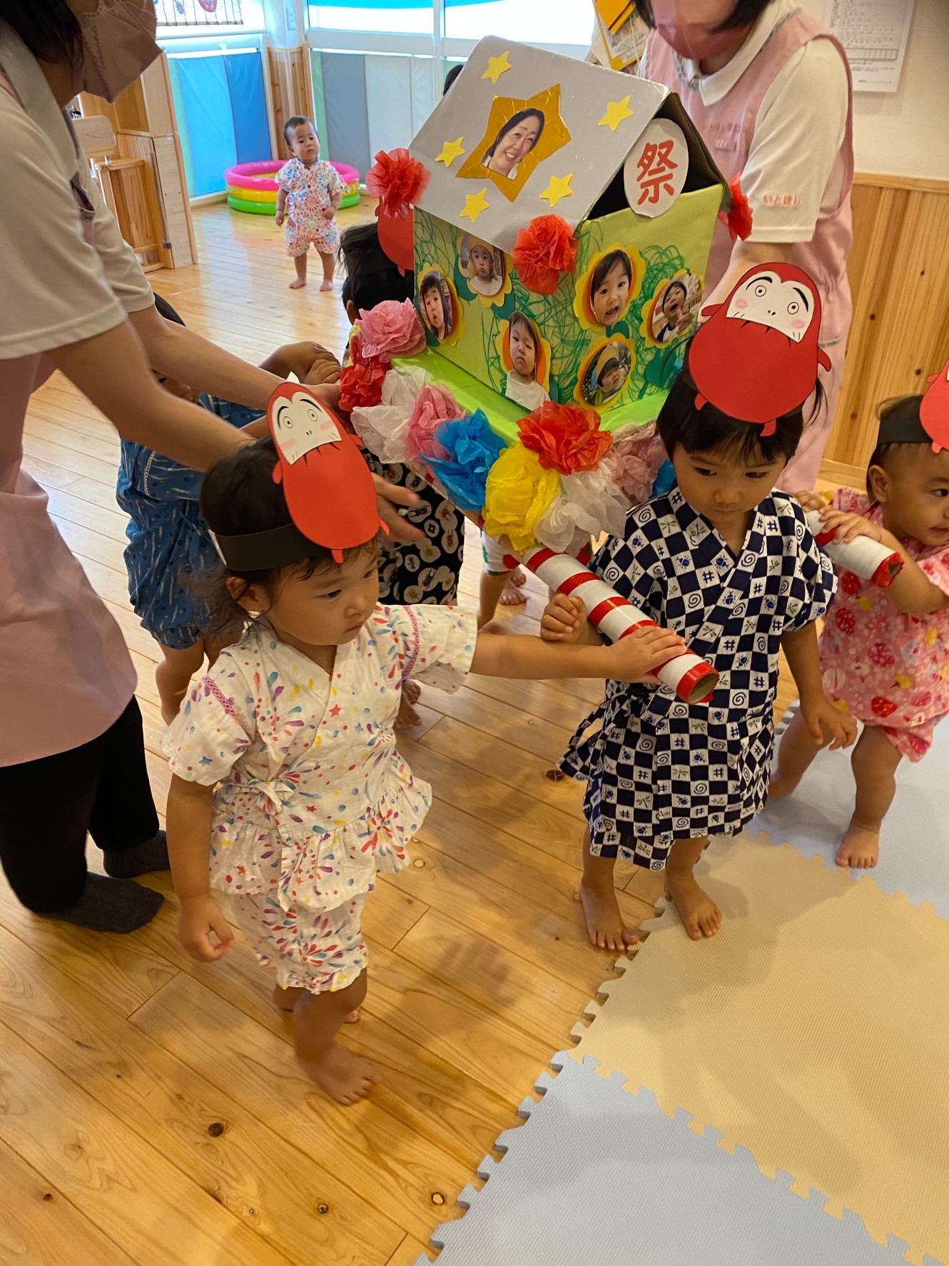 七夕祭り 今日は七夕祭りをしました!🎋🌠✨ みんな可愛らしい甚兵衛を着て、魚釣り🐠、ボーリング🎳、ヨーヨー🪀、スイカ割り🍉などを楽しみました!♪♪ みんなで作った御神輿を担いで、「ワッショイ!ワッショイ!」と大盛り上がりでした✨ また、だるまさんシリーズの絵本が大好きなので、今年はだるまさんのお面をかぶって集合写真も撮りました!📸 乳児さんもなんだから嬉しそう!☺️ 最後は、みんなで七夕給食を美味しく食べました💗🍽 これからもたくさん楽しいことして遊ぼうね〜🌟